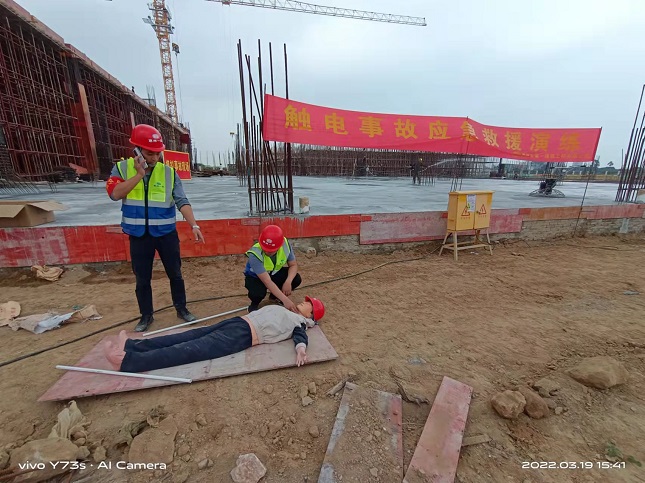 ??? 2022年3月19日下午,我司項(xiàng)目應(yīng)急救援隊(duì)伍在惠州香江智能工廠項(xiàng)目施工現(xiàn)場(chǎng)組織高處墜落、觸電、坍塌、防疫等事故應(yīng)急救援演練。