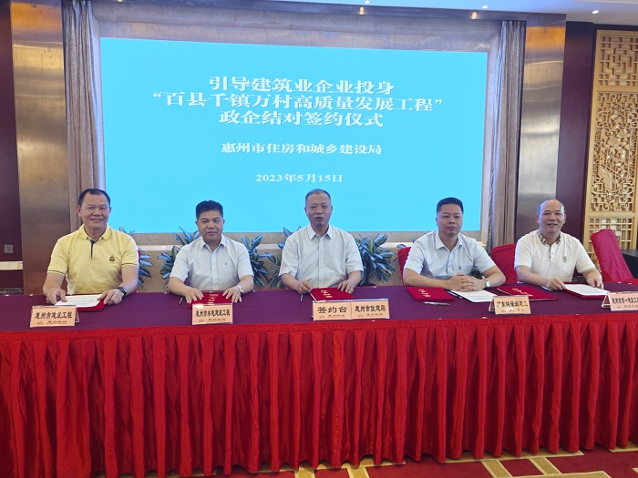 為深入學(xué)習(xí)貫徹習(xí)近平新時(shí)代中國(guó)特色社會(huì)主義思想,按照廣東省委、省政府關(guān)于實(shí)施“百縣千鎮(zhèn)萬(wàn)村高質(zhì)量發(fā)展工程”(以下簡(jiǎn)稱“百千萬(wàn)工程”)相關(guān)部署,2023年5月15日,廣東省住房城鄉(xiāng)建設(shè)廳在惠州市召開(kāi)引導(dǎo)建筑業(yè)企業(yè)投身“百千萬(wàn)工程” 工作推進(jìn)會(huì)(珠三角片區(qū))。我司陳小勇董事長(zhǎng)在會(huì)上認(rèn)真聽(tīng)取了“百千萬(wàn)工程”的階段工作進(jìn)展情況,表示將積極響應(yīng)政府工作號(hào)召,充分發(fā)揮企業(yè)資金、材料、技術(shù)等優(yōu)勢(shì)投身到“百千萬(wàn)工程”中,并與惠州市住房和城鄉(xiāng)建設(shè)局簽署了政企結(jié)對(duì)合作協(xié)議。
