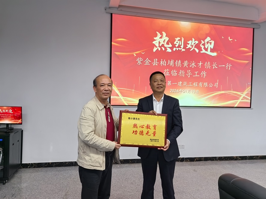 在會(huì)上紫金縣柏埔鎮(zhèn)黨委副書記黃泳才向陳小勇董事長(zhǎng)頒發(fā)“熱心教育,大愛無疆”牌匾,感謝其對(duì)柏埔教育事業(yè)的熱心支持。