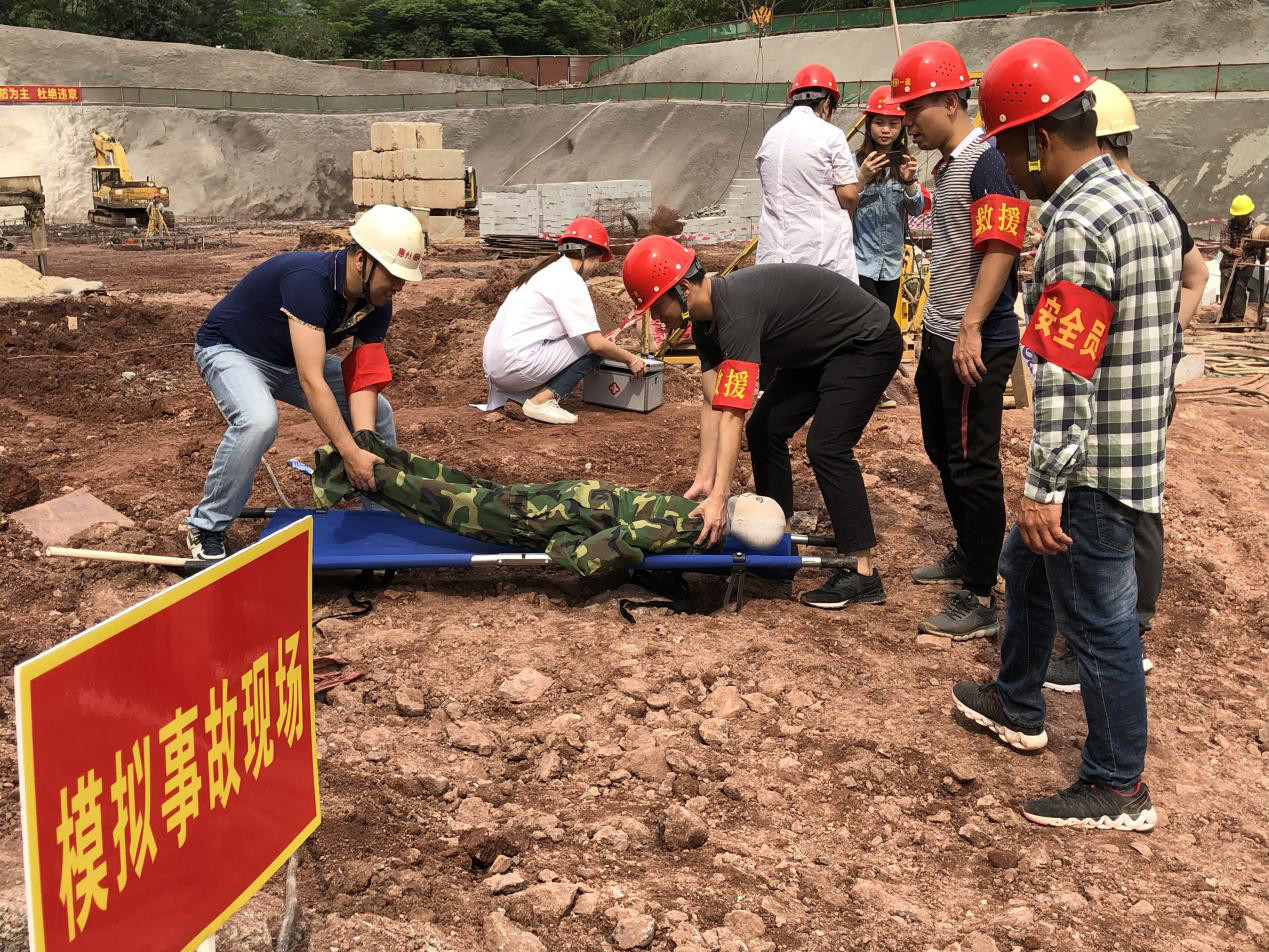? ? 2019年4月9日上午,我司的項目部應急救援隊伍在惠州學院科技產(chǎn)業(yè)大樓施工現(xiàn)場對中毒、觸電、坍塌、消防等進行應急救援演練。